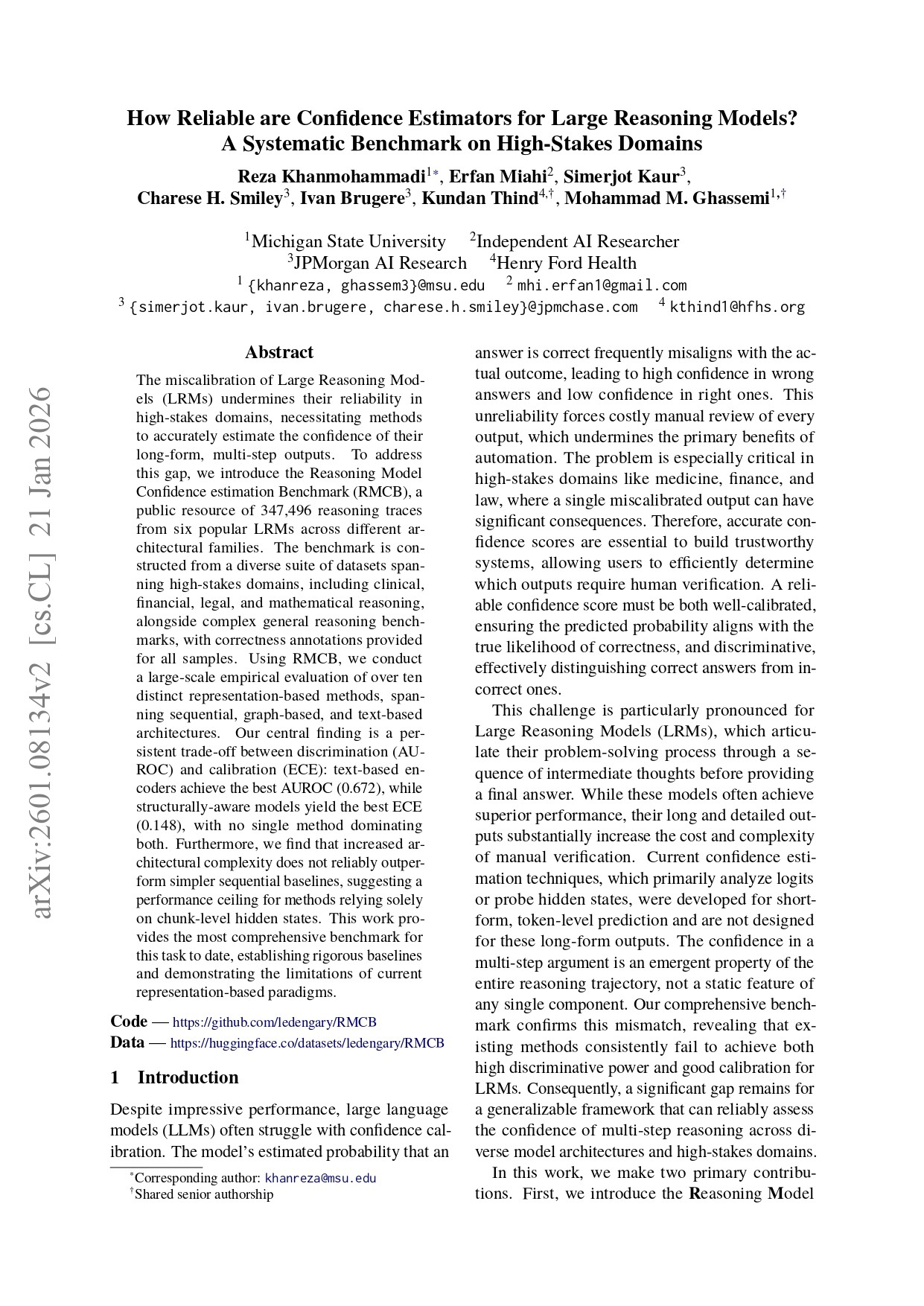 My research develops confidence calibration methods for LLMs, LRMs, and VLMs with a focus on high-stakes domains like healthcare, finance, and law where a model's overconfidence has human consequences.